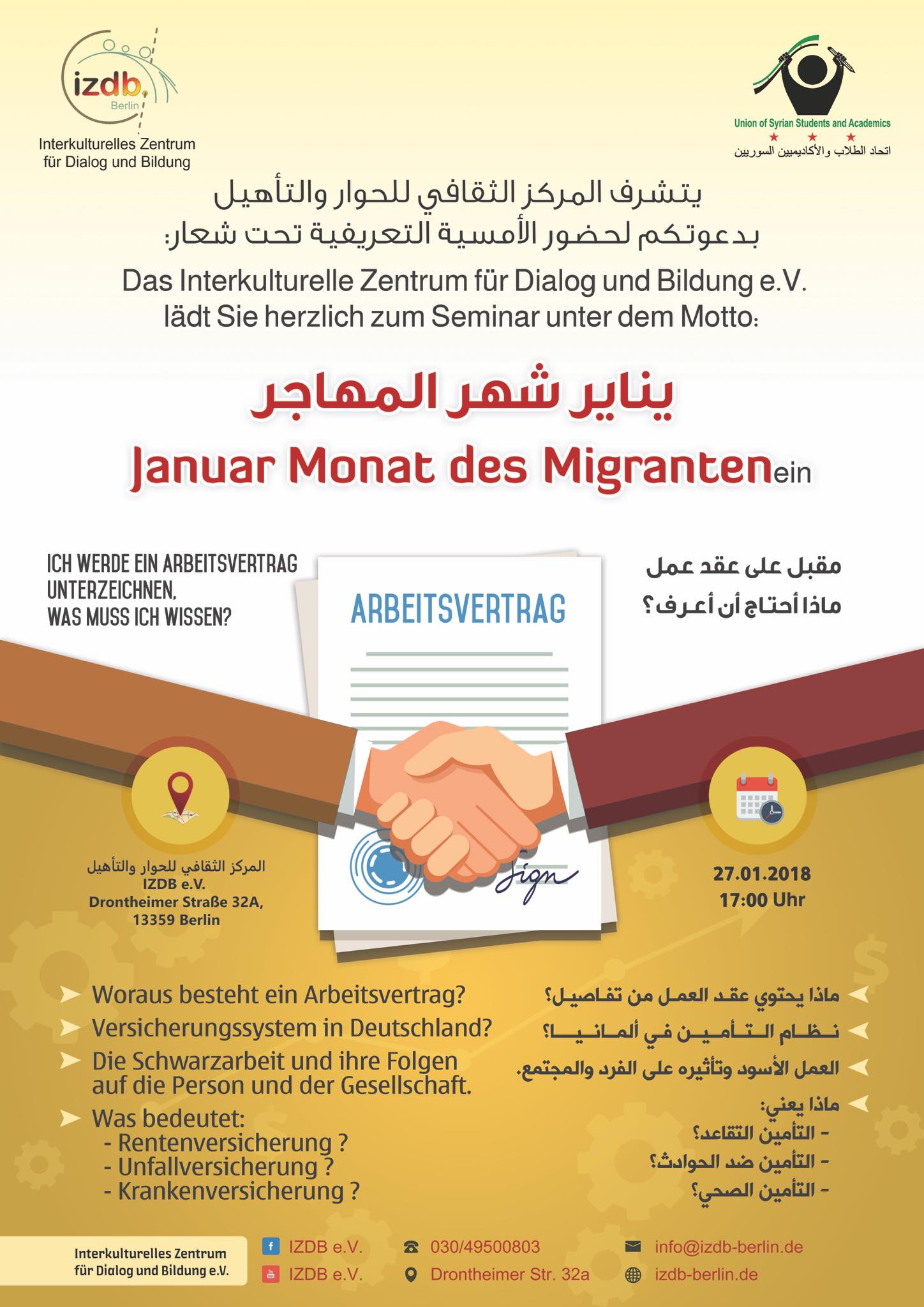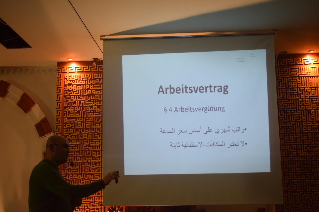 Hierzu hatten wir im Monat Januar folgende Aktivitäten angeboten: Die erste Aktivität geschah in Kooperation mit dem syrischen Studenten- und Akademikerbund und fand unter dem Motto „Ich werde ein Arbeitsvertrag unterzeichen, was muss ich wissen“ statt (27.01.2018). Hierbei referierte Dr. Adnan Al-Halbouni über die Wichtigkeit der Arbeit und deren Stellenwert im Bezug auf den gesellschaftlichen Fortschritt und seine Erhaltung. Danach referierte er im Detail über die Inhalte eines Arbeitsvertrags und welche Pflichten und Rechte an diesem gekoppelt sind.