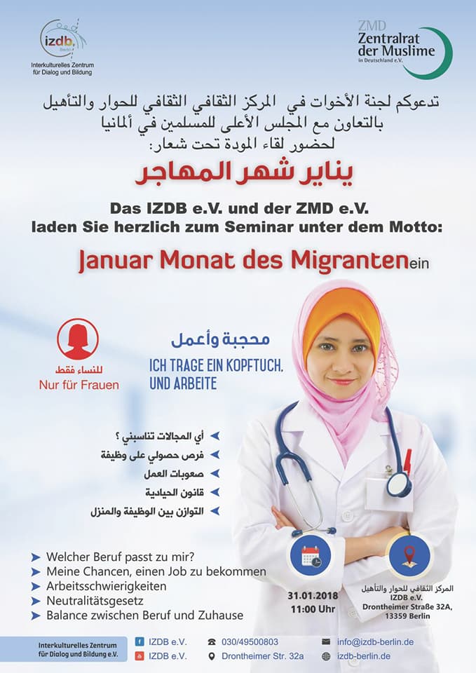 Unter anderem ging es um steuerrechtliche Themen und Versicherungen. Abschließend warnte er vor Schwarzarbeit oder Betrug gegenüber dem Staat, in all seinen Formen. Dabei untermauerte er seine Aussagen mit den islamischen Tugenden, wie Ehrlichkeit, Loyalität und Hingabe. Die zweite Aktivität geschah in Kooperation mit dem „Zentralrat der Muslime in Deutschland“ und war speziell an die Frauen gerichtet. Das Thema dieser Veranstaltung war: „Ich trage ein Kopftuch, und arbeite“.