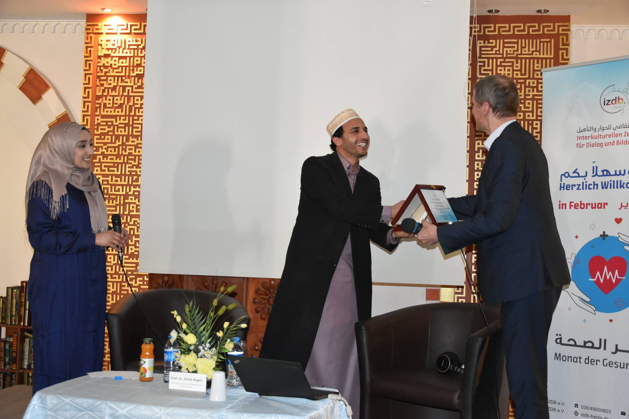 Die dritte Veranstaltung fand unter dem Motto „Das Blut und seine Geheimnisse“ mit dem Professor und ehemaligen Leiter der Blutbank der Charité Prof. Dr. med. Abdulgabar Salama statt. Eröffnet wurde die Veranstaltung durch eine kurze Einführung unseres Scheikhs Khaled Siddiq, wobei er über die Gesundheit aus islamischer Sicht sprach und sie mit Zitaten aus dem Quran und dem Leben des Propheten, Friede und Segen seien auf ihm, untermauerte. Der Professor stellte uns uns Methoden zur Säuberung und Reinigung des Blutes vor und sprach ebenfalls über die Prävention von mit Blut assoziierten Erkrankungen. Außerdem ging er auf Mangelzustände und deren Behandlung ein.