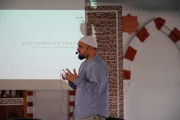 Nach der Bildercollage folgte ein zehnminütiger Impulsvortrag von Imam Ferid Heider, dem Vorsitzenden des Teiba Kulturzentrums in Spandau. Imam Ferid Heider thematisierte die Problematik des antimuslimischen Rassismus und die allgemeine Stimmung in Deutschland. Er betonte die bedeutende Rolle der Medien bei der Bildung von Vorurteilen gegenüber der muslimischen Gesellschaft. Ein Beispiel, das er nannte, war die öffentliche Wahrnehmung des Eid-Gebets im Freien, das fälschlicherweise als Provokation interpretiert wird. Er erklärte, dass das Gebet im Freien eine Einladung zur Offenheit darstellt und keine Machtdemonstration ist, wie oft unterstellt wird.